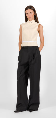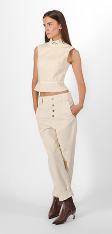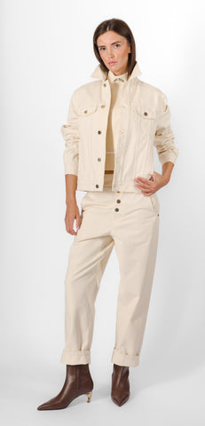 Moschino jacket in raw cotton gabardine, straight line with boxy cut, classic pointed collar, front closure with contrasting metal buttons, two flap and button pockets on the roof.