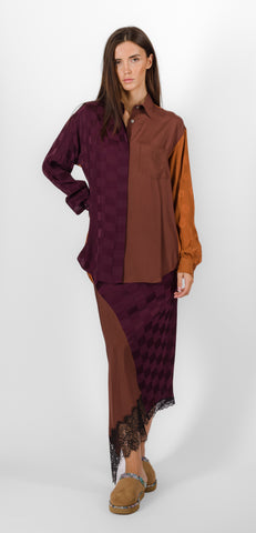 Moschino midi slim fit skirt made of silk blend with multicolored patchwork design in shades of burgundy, orange and brown, asymmetrical hem embellished with delicate lace, calf strap detail.