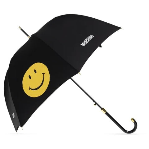 Moschino black umbrella with yellow smiley, white logo detail, wrist strap, open-close button