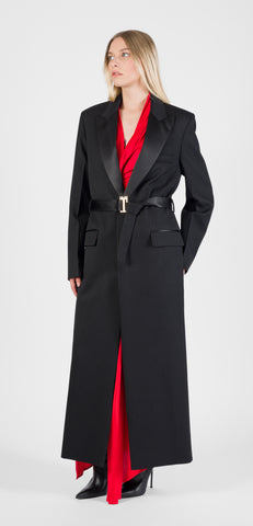 Victoria Beckham asymmetrical and draped midi dress, high-gloss jersey bodice, crepe de chine skirt, button closure front neckline with thread loop, short roller sleeve, twist draped waist detail, split front skirt, hidden side zipper.