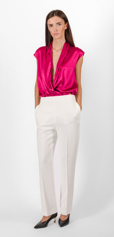 Alberta Ferretti top a mantella con scollo a V, drappeggiato sulle spalle, lasciando le maniche aperte. Top reversibile, da indossare fronte o retro, per due look diversi in un solo capo.