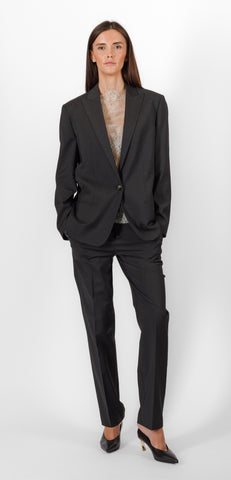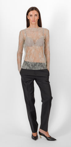 Alberta Ferretti pantalone grigio dal taglio sartoriale, chiusura con zip e gancio, una tasca stiletto sul retro, due tasche davanti.