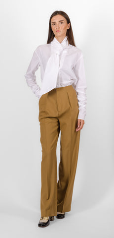 Moschino camicia in popeline con tessuto aggiuntivo sul colletto che può essere annodato intorno al collo a cravatta o lasciato cadere a cascata lungo il corpo, maniche delicatamente arricciate, chiusura con bottoni e lunghezza che scende appena sotto i fianchi.