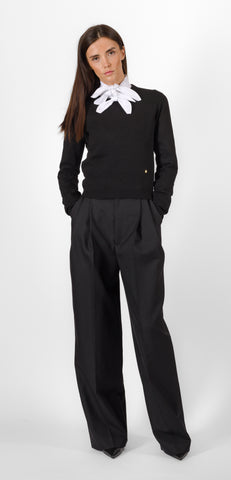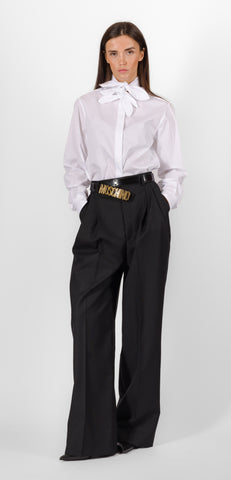 Moschino camicia in popeline di cotone con righe jacquard, collo alto con allacciatura a fiocchi e piccola lettera M ricamata sul davanti, maniche lunghe, polsini con bottone, chiusura con bottoni sul davanti.