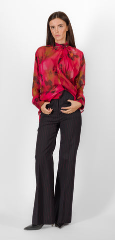 Victoria Beckham giacca monopetto gessata, tasche a patta. tasca sul petto a filetto con dettaglio ricamo in rosso, dettaglio rosso sul bottone dei polsi.