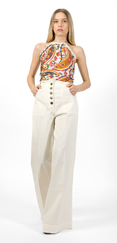 Etro top dal design a bandana realizzato in twill di pura seta e decorato da un motivo Paisley floreale all over. Lo scollo all'americana con laccetti sul retro del collo e la chiusura tramite due lembi da annodare, sempre sul retro, lasciano la schiena quasi interamente scoperta.