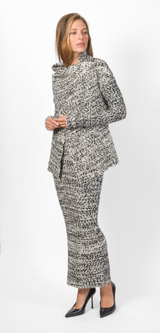 Alberta Ferretti gonna lunga e aderente a vita alta in tessuto grafico di lana bouclé bianco e nero.