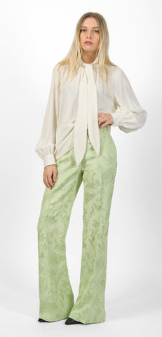 Etro pantalone dalla linea bootcut realizzati in viscosa cloqué dall'effetto leggermente in rilievo, delicato motivo floreale jacquard, rifinito con una piega stirata fronte e retro, vestibilità regular, vita alta, chiusura a scomparsa, tasche laterali a filo, tasche posteriori a filetto con bottone.