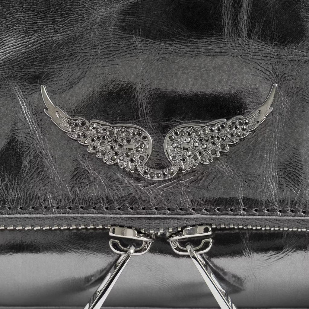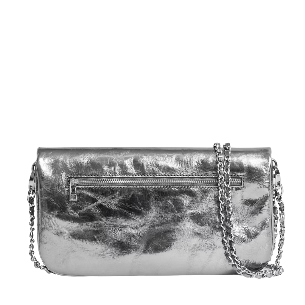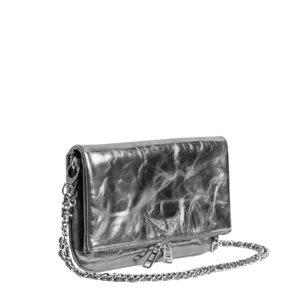 Zadig & Voltaire pochette in pelle metallizzata, due catene intrecciate in pelle e metallo rimovibili, patta con chiusura zip e magnetica, piccola tasca posteriore con zip e tasca interna applicata, ali signature ornate di strass. Si porta a mano, a spalla o a tracolla.