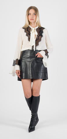 Zadig & Voltaire camcia a maniche lunghe da donna , rifiniture in pizzo nero a contrasto su scollo e maniche, scollo a V profondo con cravatta, maniche lunghe svasate.