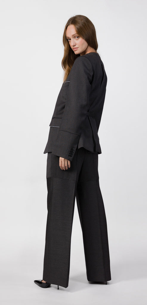 Victoria Beckham jacket without collar, contrast on the front pockets, internal strap closure, central detail on the back with buttonholes and button.